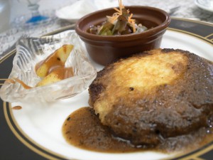 メインのハンバーグ。チーズが乗って、下に玉葱。うまいんだこれが。